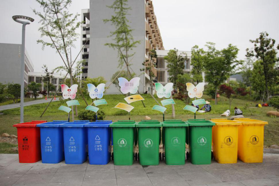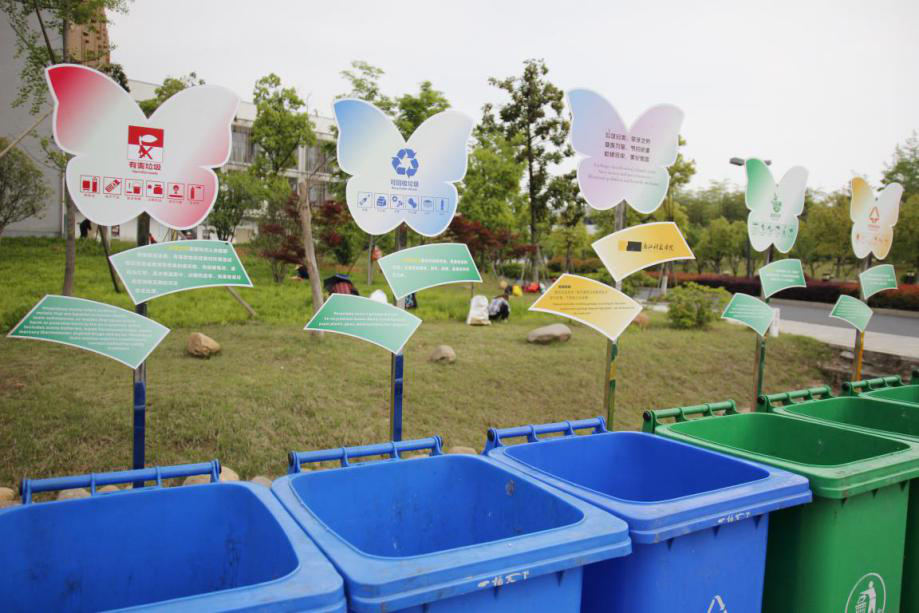 4月25日,五只“花蝴蝶”翩翩然飞进安吉校区。循着花蝴蝶的轨迹,就看到了在雅竹书院、翠竹书院楼下的两处垃圾分类试点站。试点站由一套分类垃圾箱和分类指南组成,同学们将手边垃圾按指南类别投放至对应的垃圾箱即可。